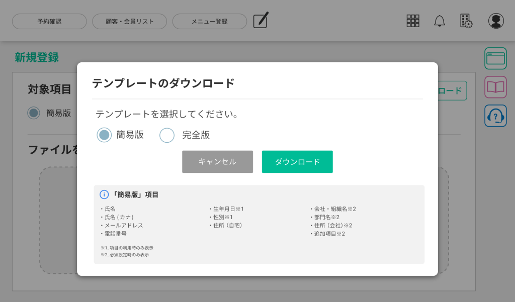 顧客データを登録する際、登録内容にあわせたテンプレートがダウンロードできます。テンプレートは、顧客の基本情報のみ登録できる「簡易版」と顧客の詳細な情報または会員情報が登録できる「完全版」の2種類から選択いただけます。用途にあわせてテンプレートを選択することで、必要な項目だけを効率的に入力できます。