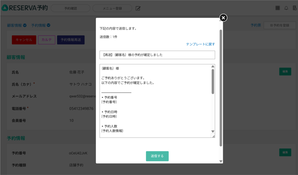 予約申込情報や予約情報、抽選申込情報や当選結果を再送できます。再送ごとに通知の件名や本文をカスタマイズすることも可能です。例えば、来店前に予約者から「予約内容を再確認したい」と連絡を受けた際に、予約者が気づきやすいように文面を工夫して再送することで、スムーズに対応できます。