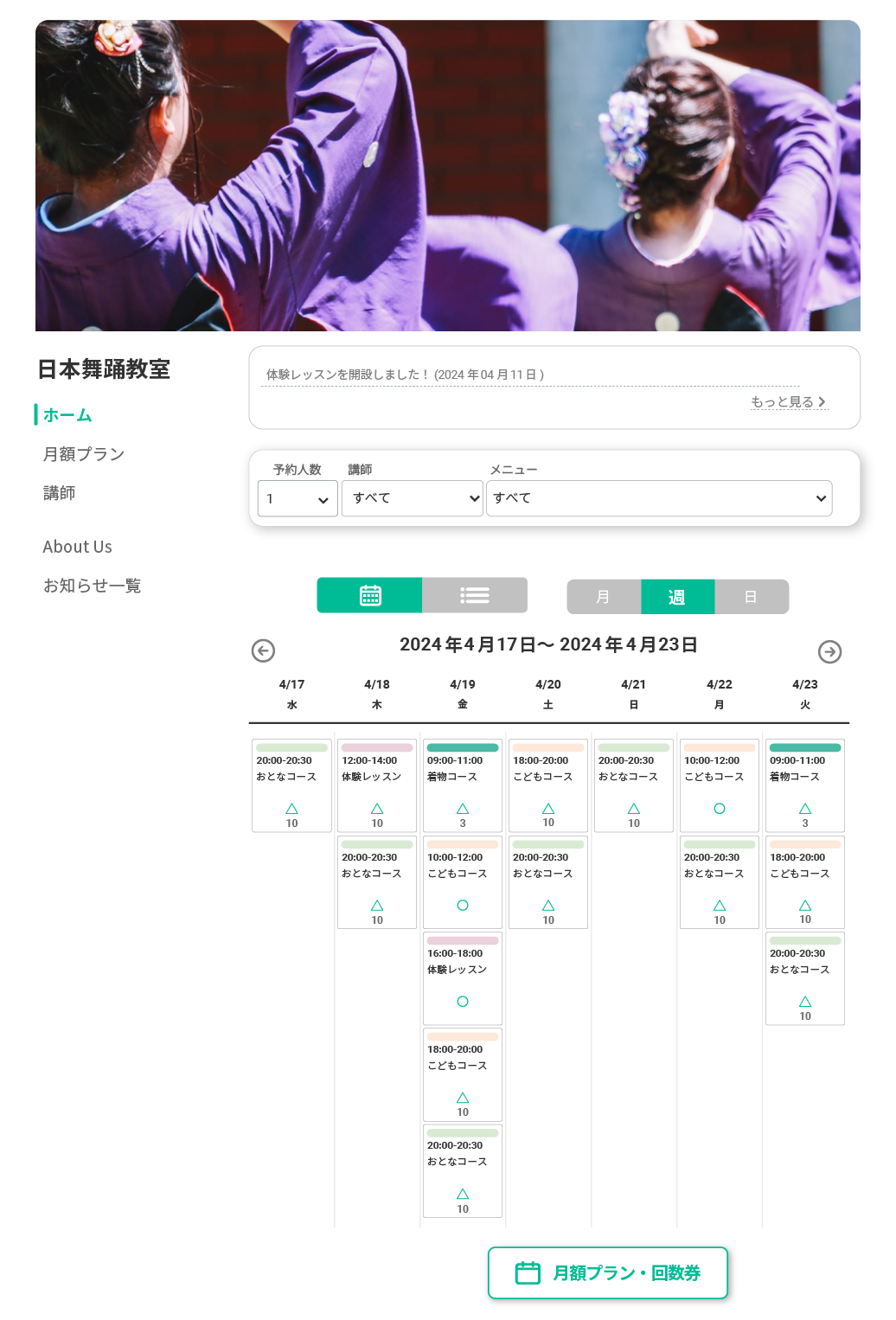 RESERVA予約は、日本舞踊体験、日本舞踊稽古をはじめとする予約に対応している予約管理システムです。インターネット上で24時間いつでも予約を受け付けることができます。生徒様の利便性と管理者の予約にかかわる煩雑な業務を大幅に改善します。